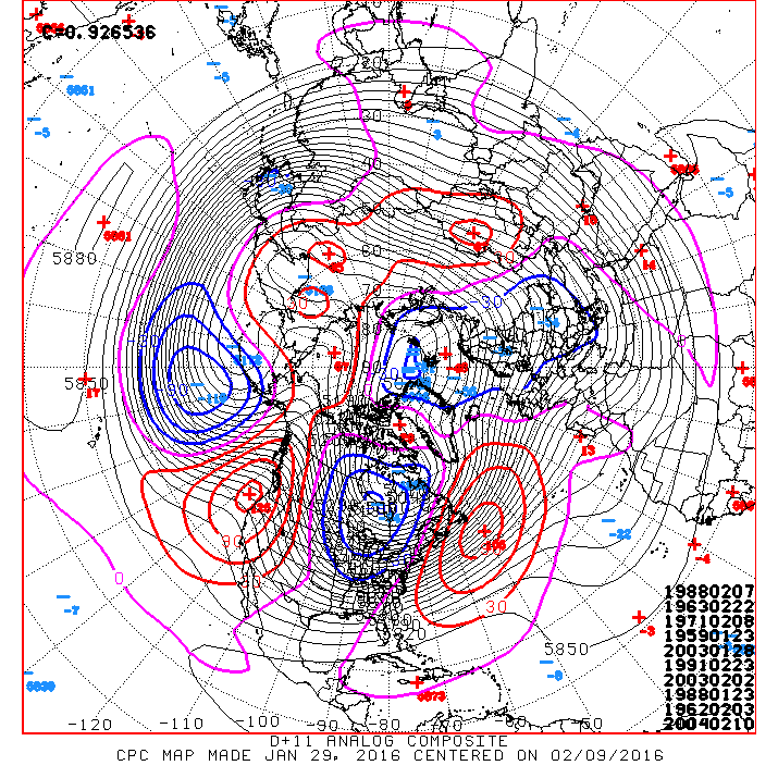 The Friday afternoon updated Climate Prediction Center Day 11+ Analogs have been issued. Looking like the 'coldest' air is situated over our Region and it looks dry.