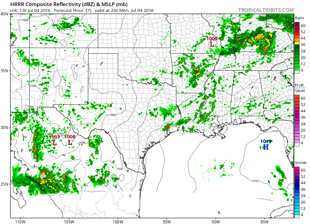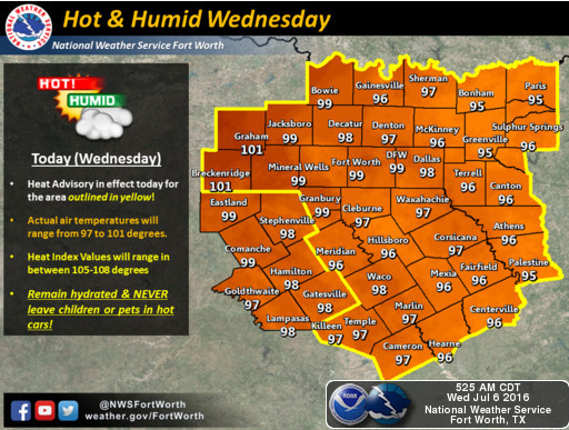 Overnight convective complex in the Dallas/Ft Worth area dropped a record 1.87 inches of rainfall at DFW and the outflow boundary continues to slowly sag SE. The 13Z HRRR (High Resolution Rapid Refresh) Meso Model is indicating the possibility of some Weather Fireworks as the boundary near SE Texas later this afternoon/evening during peak heating. A Heat Advisory has been issued through tomorrow, so make sure to stay hydrated out there and watch the skies toward the North in case Thunderstorms to attempt to organize as folks head out to the Public Fireworks displays.