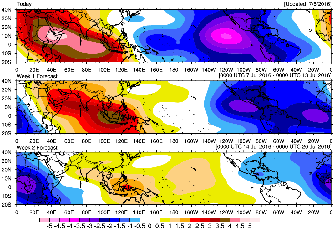 Heat Advisory looks to continue throughout the work week with possibly a slight weakening of the Upper Ridge this weekend as it shifts a bit allowing for a slight chance of cooling showers and thunderstorms with the seabreeze or a passing shortwave. The overnight ensembles are suggesting a bit of a Western trough and Eastern Ridge which could allow for a weakness over Texas to develop. It is also note worthy the Madden Julian Oscillation Precipitation Pulse arrives during this timeframe and that may assist in lowering pressures and a bit better instability as well as weakening the cap that has allowed for the dry weather of late. We are in a typical early July pattern across our Region, climatologically speaking and as the month wears on eyes begin to turn toward the Tropics as August begins.