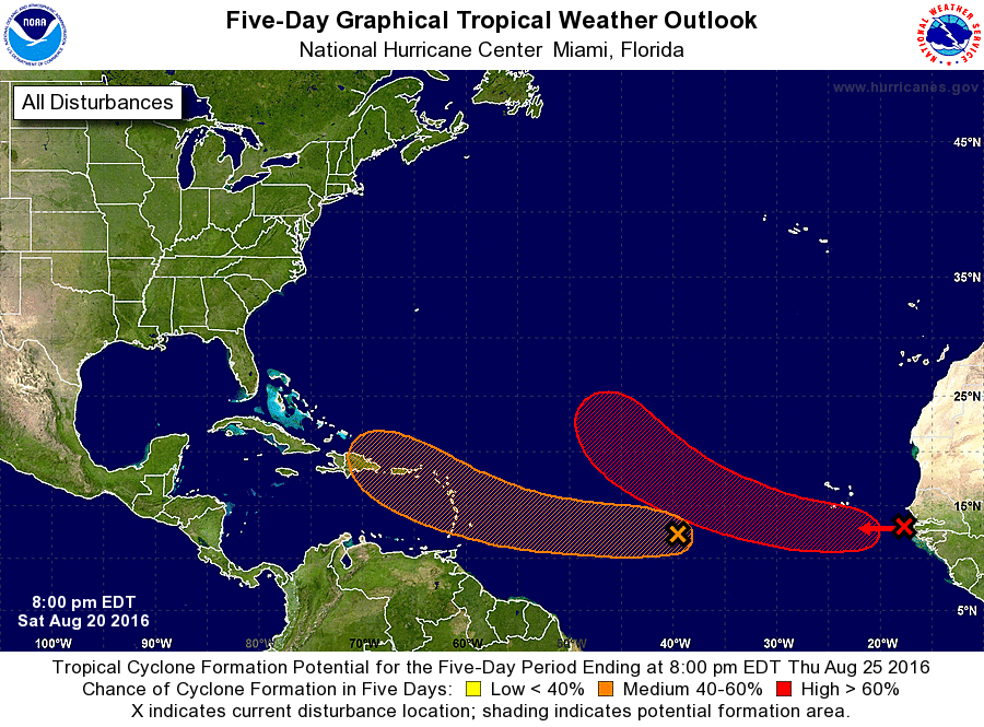 Big question is when if at all does 99L decide to develop. Looks like the favorable location would be in/near the Bahamas, but it could be sooner if the system tracks north of the big islands in the Antilles and it can flush out the dry air layer.
