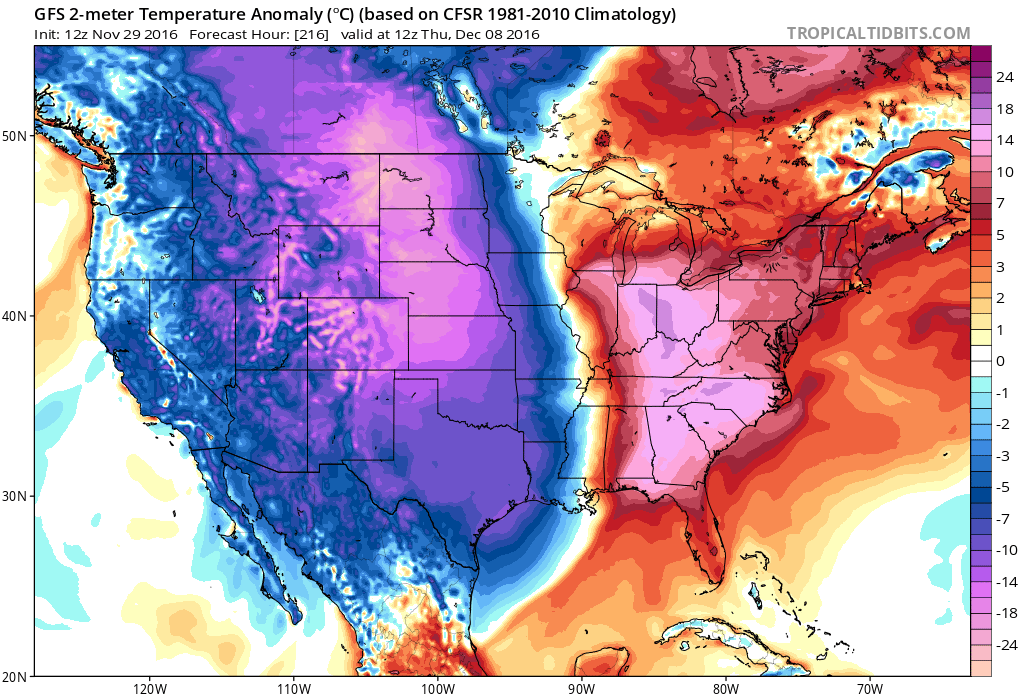 Next, the artic outbreak is looking more and more likely for the December 9th timeframe as both global models continue to keep the AO in a negative state. The ECMWF is most aggressive with the colder air showing dewpoints reaching close to the single digits over parts of SE Texas. The GFS keeps dewpoints in the mid to upper teens though. Still a longways out and modification and proper adjustments will need to be made.