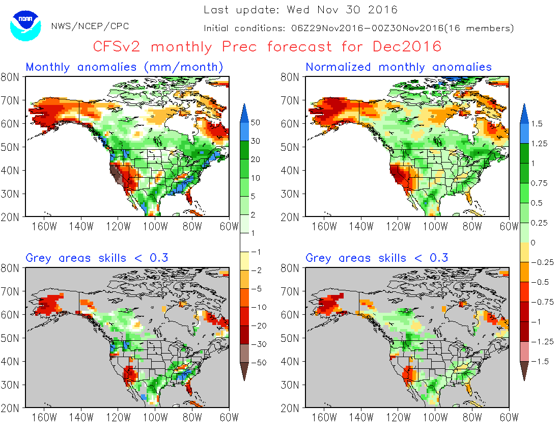 Some have been asking what the mid December toward Christmas timeframe may offer. The Updated CFSv2 Monthly climate model suggests colder than normal temperatures and slightly above normal precipitation chances. Typically I have noticed a bit of a warm bias for this particular Long Range Ensemble Model over the years. That said look how cold our source Regions of Eastern Alaska and NW Canada throughout the month.