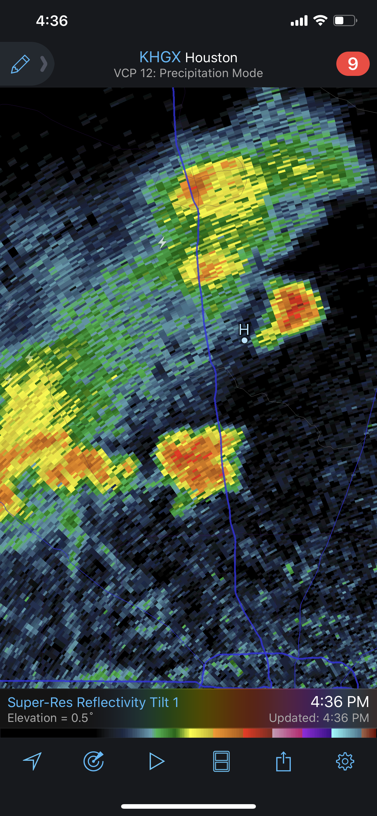 The Storm Radar app shows nothing, anywhere at all, until the end of the run (7:30pm).