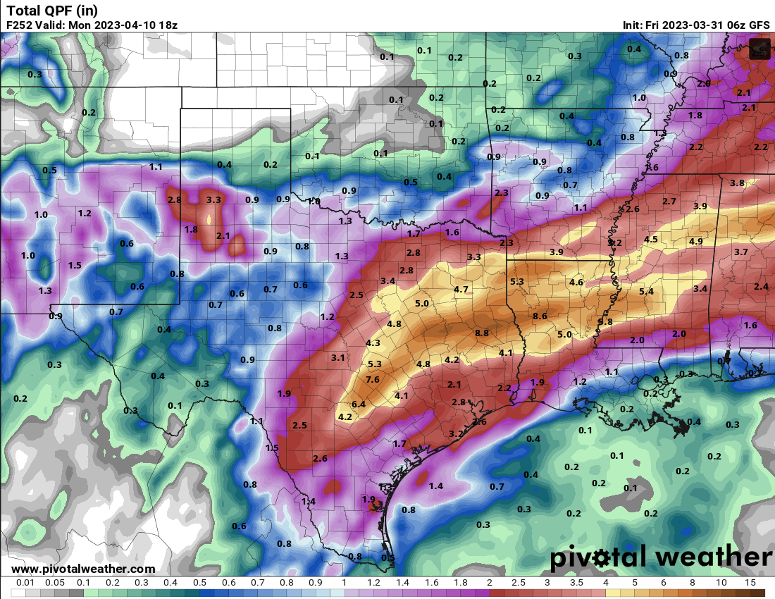 Yeah. Usually mesoscale models are more intense than globals so that’s definitely alarming.Stratton20 wrote: ↑Sat Apr 01, 2023 2:18 am Euro 00z Run has some isolated bullseyes of 10-12 inches of rain across parts of SE texas fwiw, will be interesting to see what the mesocale runs show once they get in range next week