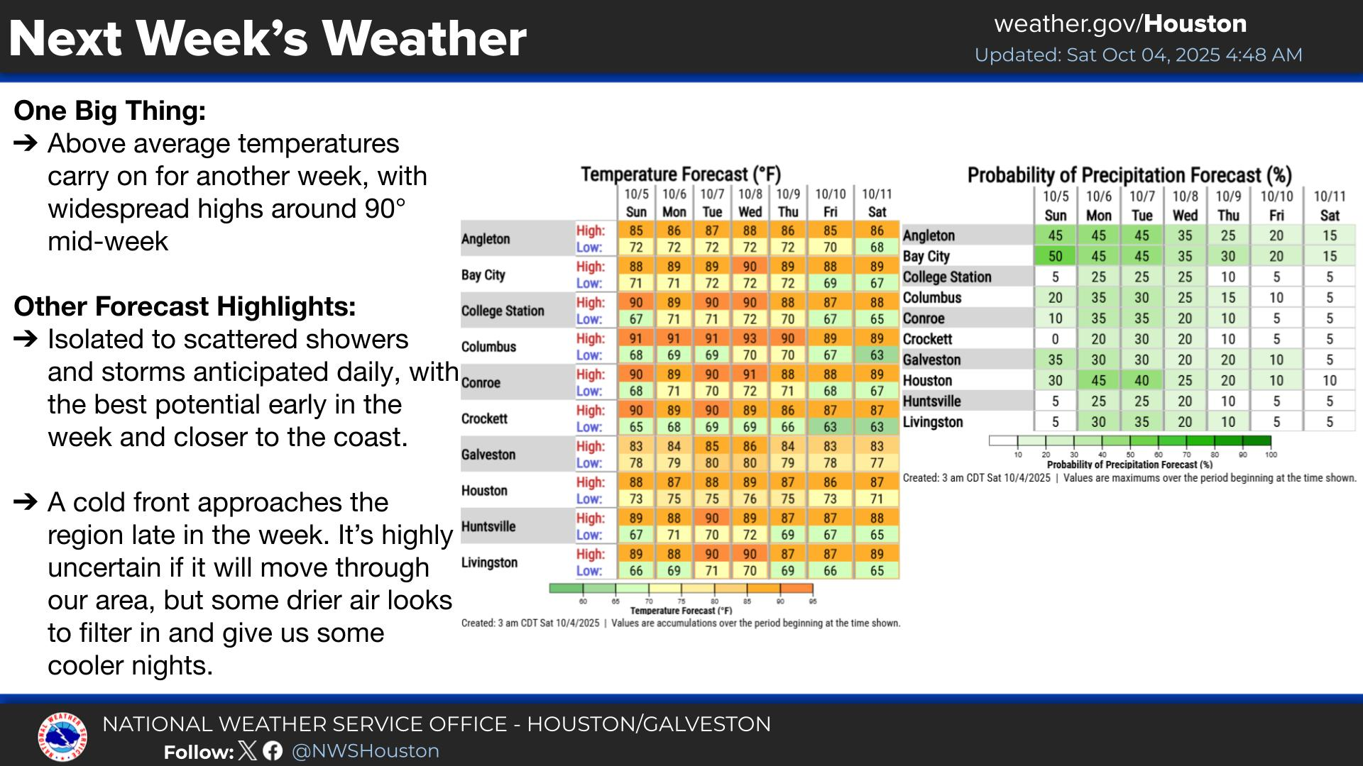 Usually we get a pretty good front towards late October, so I wouldn’t expect anything till then.tireman4 wrote: ↑Fri Oct 03, 2025 9:20 am I will say this. I remember October 2004 ( my first year of marriage), it was abnormally hot. In fact, it is still the hottest October of all time. Halloween was brutal at 88 degrees. Ridges do happen, all the time. Eventually, the heat will be dislodged ( Meteorology 101, the earth/weather always likes things equal) because the colder air up north will push down toward us. Until we have that real strong front, we will deal with this.