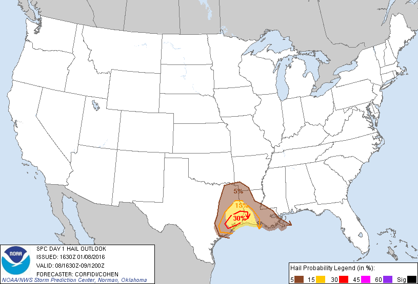 We will need to monitor for the potential of strong to possibly severe thunderstorm development particularly the overnight hours tonight into early Saturday morning across most of SE Texas. The next in the series of Pacific storms looks to travel a bit further S across our Region bringing a bit better dynamics. The primary threat appears to be hail with a gusty thunderstorm or two possible.