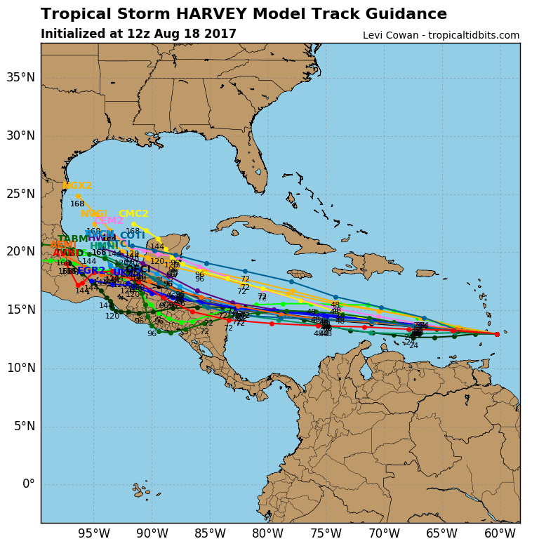 On this track Harvey will move across the eastern and central Caribbean Sea and approach the northern coast of Honduras late this weekend. By days 4/5 (early next week) Harvey will likely be located over the western Caribbean Sea approaching either Belize or the Yucatan. It is possible that Harvey could landfall along the northern coast of Honduras or track just north over the open waters of the SW Caribbean Sea.