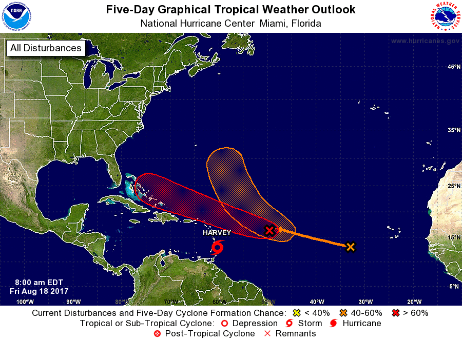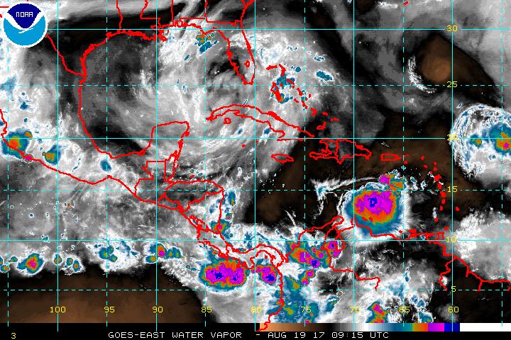 The area of low pressure approaching the Windward Island yesterday was upgraded to Tropical Storm Harvey based on the afternoon USAF mission yesterday. Overnight the convective cloud pattern of Harvey has shown little organization with sporadic bursts of convection and very little if any banding features. Mid and upper level easterly shear continues to hamper the circulation removing what thunderstorms that do develop toward the W/SW side of the system. Early this morning the “center” passed very near Barbados with a minimum surface pressure of 1006mb reported at the airport. Since then the morning USAF mission has had a hard time finding a defined low level center with the first pass showing only hints of westerly winds on the south side of where the center was expected to be. The plane has found an area of near tropical storm force winds across the northern semi-circle of the circulation. It may be that the small and well defined center yesterday has become more broad and disorganized overnight.