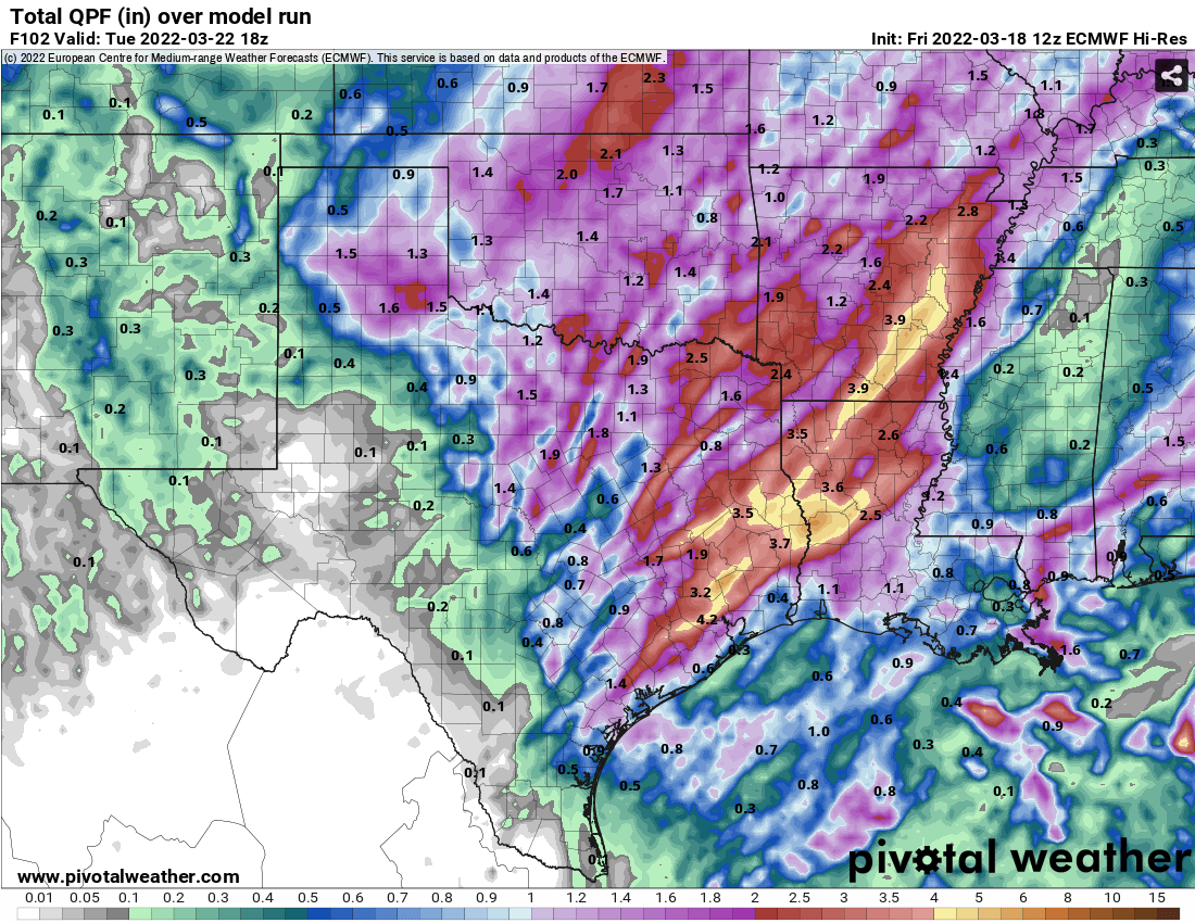 Cpv17 wrote: Thu Mar 17, 2022 7:25 pm There’s a huge difference between the Euro and GFS. GFS is pretty much crickets, while the Euro has 1-2” over a good part of southeast TX. The GFS has higher amounts towards the Golden Triangle and into LA. The Euro has huge totals towards central and north TX.