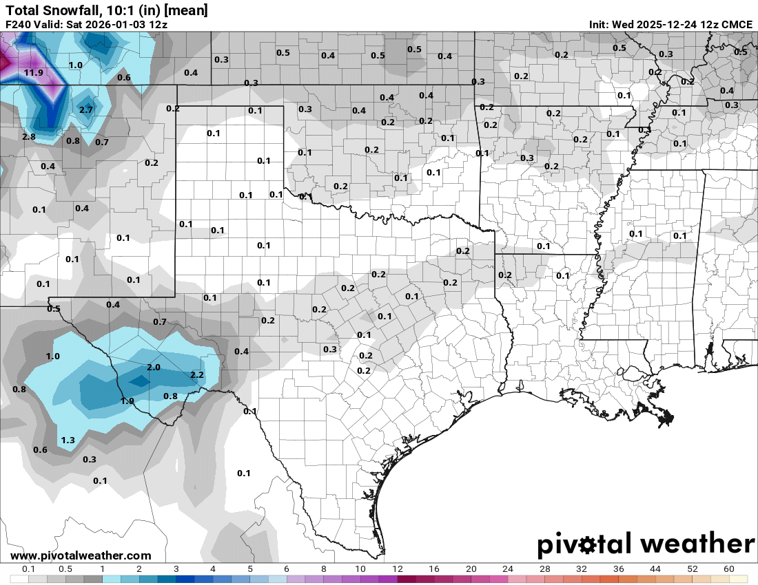 Snow in the horizon?DoctorMu wrote: ↑Wed Dec 24, 2025 9:33 pmCanadian, Euro, EPS are picking up a disturbance and snow around El Paso and the Big Bend - EPS and especially Canadian suggest the disturbance heads east. Other models aren't so sure yet. Something new to look out for.Stratton20 wrote: ↑Wed Dec 24, 2025 5:15 pm thought this would be of interest to anyone traveling in state over the next 7 days , GFS op not seeing it, but this is just inside of 6 days , but the GEFS, GEPS and even a couple of EPS members are indicating a secondary disturbance swings in behind the frontal passage and interacts with the cold air that will be funneling in, now let me emphasize that no one should get their hopes up, but thibgs do appear to look a little interesting as we get closer to the 29/30th time frame