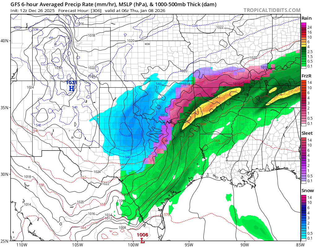 Canadian, Euro, EPS are picking up a disturbance and snow around El Paso and the Big Bend - EPS and especially Canadian suggest the disturbance heads east. Other models aren't so sure yet. Something new to look out for.Stratton20 wrote: ↑Wed Dec 24, 2025 5:15 pm thought this would be of interest to anyone traveling in state over the next 7 days , GFS op not seeing it, but this is just inside of 6 days , but the GEFS, GEPS and even a couple of EPS members are indicating a secondary disturbance swings in behind the frontal passage and interacts with the cold air that will be funneling in, now let me emphasize that no one should get their hopes up, but thibgs do appear to look a little interesting as we get closer to the 29/30th time frame