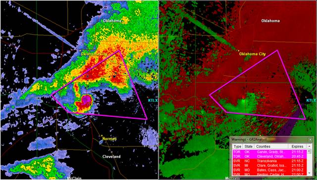 * 3:35 p.m. -- @NWSNorman: 3:34pm - tornado moving toward lake Stanley Draper and will come VERY close to the KTLX radar site. #okwx