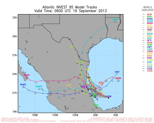 The general trend via the 12Z suite of guidance including the Euro suggests that Manuel's moisture may be a bit too strong over Texas and the trough and frontal boundary may be much weaker that expected and have a lot of trouble making it too far S. Most of the Operational and even the GFS ensemble guidance suggest the front will stall along or just S of I-10 and linger. The Euro also suggests that 95L will become trapped or stall just SE of Brownsville and linger S of Texas through hour 168.