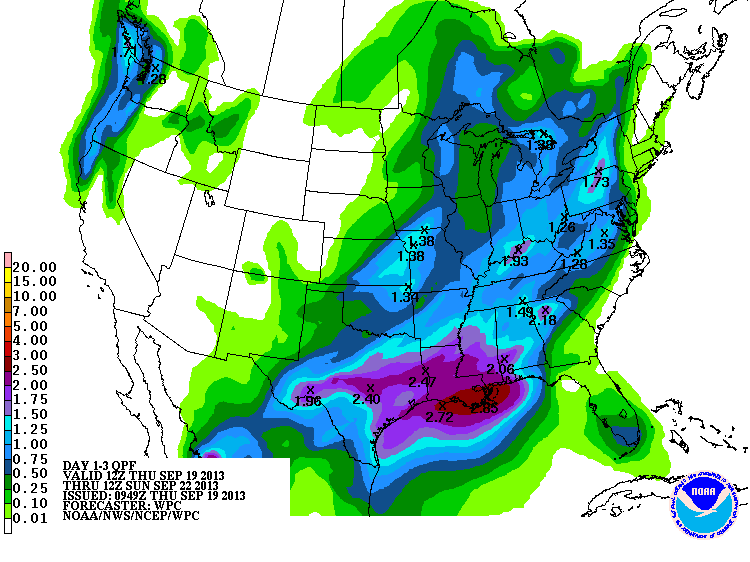 Remains and associated moisture from tropical cyclones Ingrid and Manuel will be moving northward over the next 24 hours into TX. At the same time the first “real” cool front of the fall season will be moving down the plains and into TX early Friday. Additionally, deep tropical moisture associated with a complex disturbance (95L) over the Yucatan this morning will also progress NW toward TX by Friday. Lastly, a fairly strong short wave in the upper air flow will carve into the state by Friday afternoon helping to aid in stronger lift of a near completely saturated air mass.