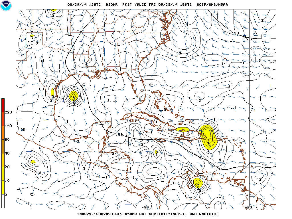For what its worth the 12Z GFS brings that mess N of the Yucatan NNW and develops a 850 vort max that pushes inland between Matagorda and Galveston. It also looks like a good surge of deep tropical moisture surges into the Western Gulf with a tropical wave nearing the Yucatan in the NW Caribbean. Further E in the Caribbean SSW of Greater Antilles, another sheared tropical wave is moving W and pressures are beginning to fall across the Western Caribbean.
