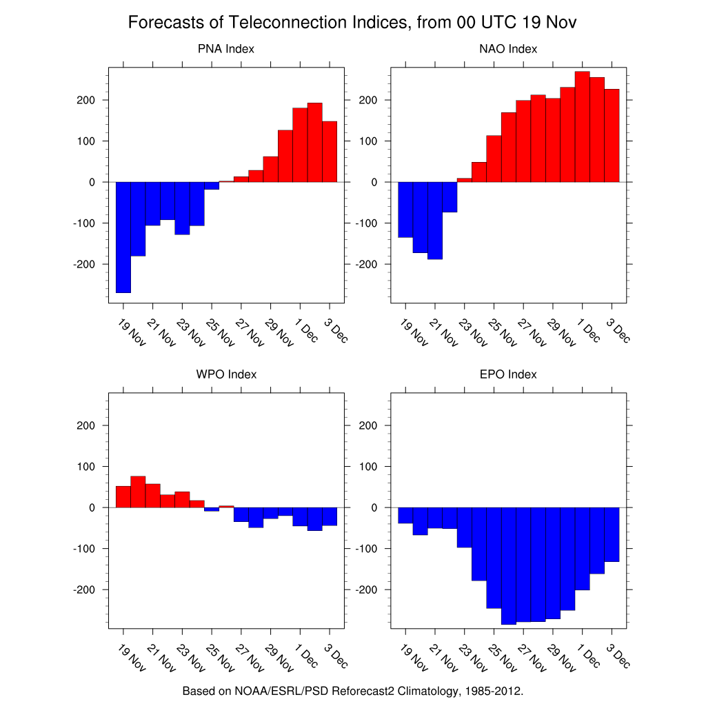 The 12Z GFS suggests a very cold Arctic High settling into the Plains on Saturday/Sunday as we end the busy Thanksgiving Holiday travel period. The GFS also suggests a land falling Eastern Pacific tropical cyclone along the West Coast of Mexico as the cold air is entrenched across the Lone Star State. There are also indications of a Coastal trough/low organizing near Brownsville. While this is still a ways out, the teleconnection indices continue to advertise a very -EPO and a + PNA regime which tends to build a Ridge into Alaska allowing a chunk of very cold air to drop South from Siberia into Western Canada and into the Plains.