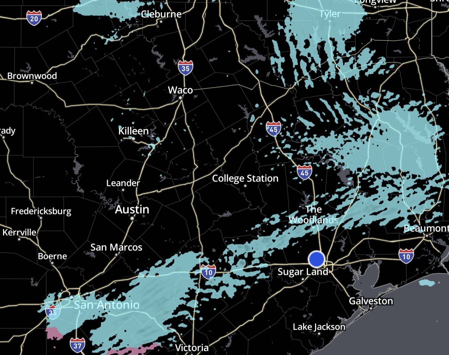 Waller to Conroe has sleet or flurries. We're getting gapped. Snowing in Tyler, down through Lufkin, Beaumont, then west to The Woodlands, Schulenburg to San Antonio.
