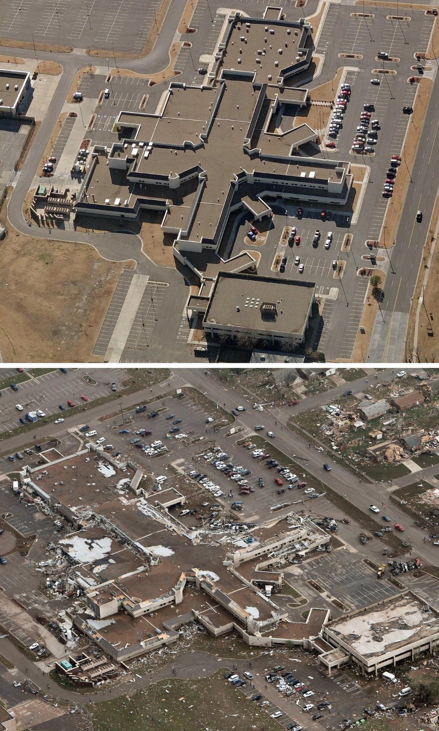 The lead warning time for this tornado was 16 minutes or nearly double the average. Most residents in the path knew the tornado was coming and did exactly the correct tornado safety precautions. In the areas of EF5 damage in/around the elementary schools unless underground there was little hope of surviving. The large diameter of the tornado (1.3 miles) suggest a single location in the funnel may have sustained winds of 150-220mph for over 1 minute....a very long time. There is little doubt that the numerous tornado shelters installed in many homes after the 5-3-99 tornado saved many lives in this event. Tower Plaza Elementary School: Brairwood Elementary School and surrounding subdivision: Moore Medical Center Ariel Damage Images:
