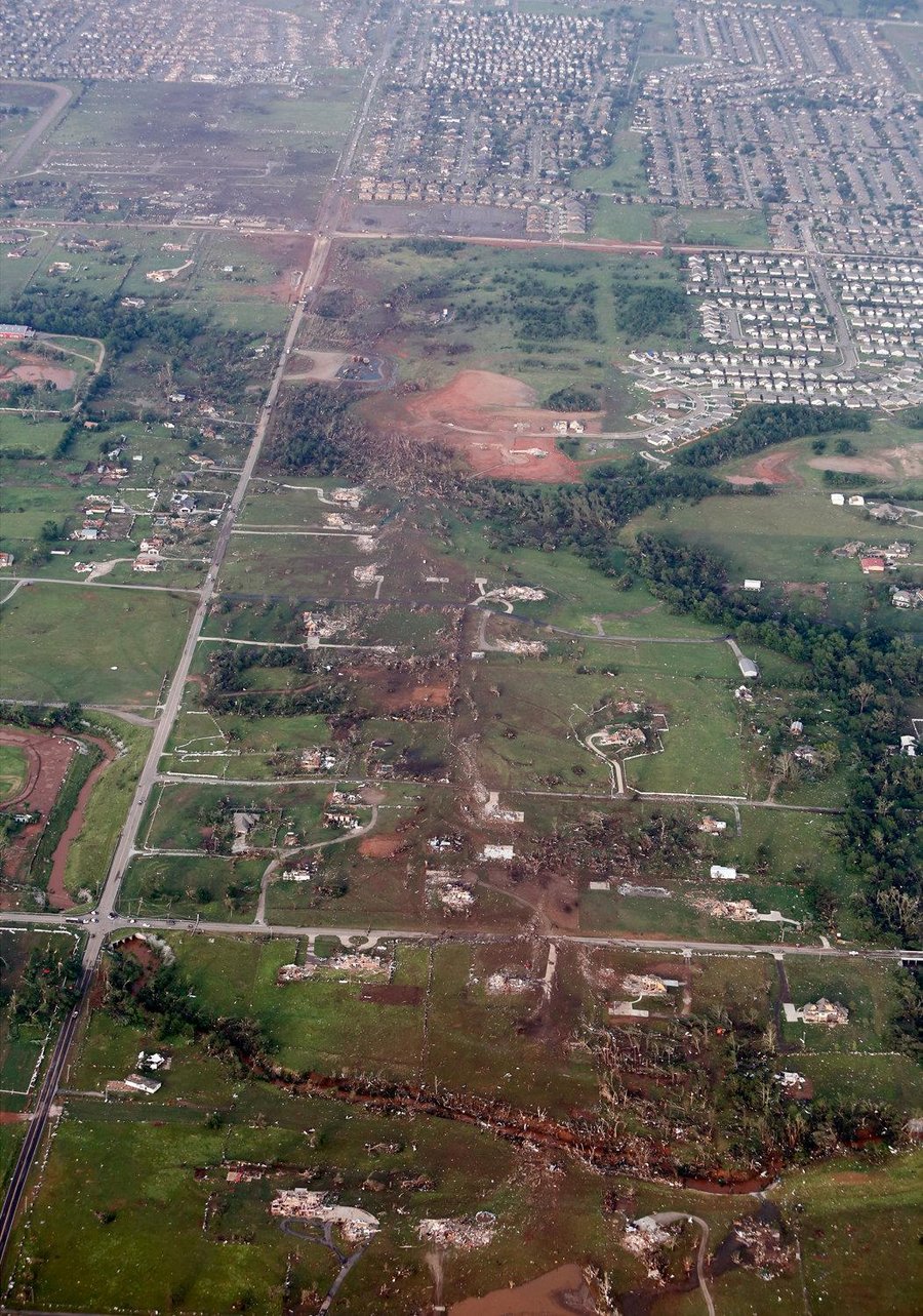 The surprisingly low number of fatalities for such a large tornado is likely attributed to the time of day which the tornado hit and the longer than average lead warning times. The tornado struck in the middle of the afternoon when most residents were at work and not at home unlike the Joplin, MO tornado (Sunday evening at dinner time) and the 5-3-99 Moore Tornado which struck after 600pm. Most of the damage with this tornado occurred in subdivisions and luckily many of the homes were not occupied at the time of the tornado. It is also clear that the two elementary schools impacted offered some of the best shelter/protection even though they suffered extensive damage as noted in the damage photos below of the surrounding subdivision. Children being in those schools and not in the surrounding homes where many likely lived saved their lives.