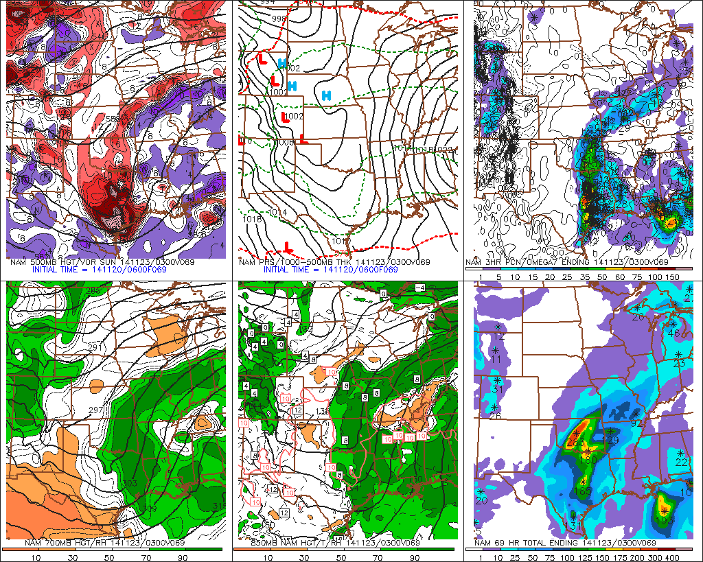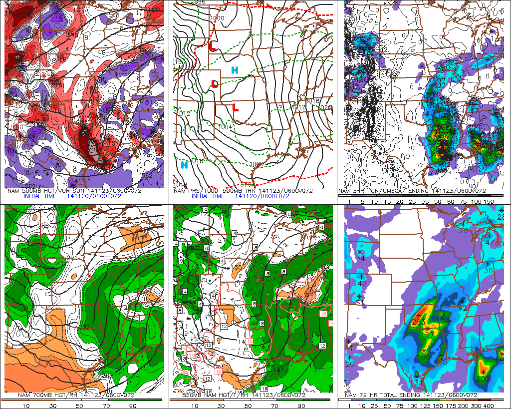Main threats appear to be tornadoes and wind damage in the noon to midnight time period on Saturday. I am tempted to favor the tornado threat higher in the southern 2/3rds of the area where instability is forecasted to be strongest, but since we are 72 hours out I think a general widespread threat is best at the moment.