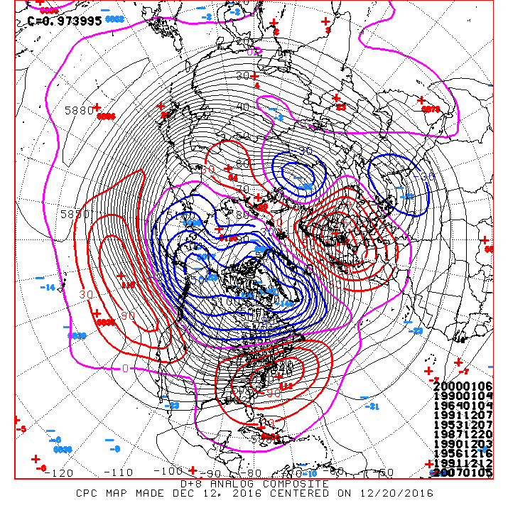 srainhoutx wrote:Looking ahead toward the Christmas timeframe via the morning Updated Climate Prediction Center GFS Super Ensembles Day 11+ Analogs, that guidance suggests a big building Ridge across the Northern Pacific indicated by the deeper shades of Red as heights build as well as a strengthen upper Ridge across the SE and Eastern United States that tends to warm up and slow down progression of any colder air from spreading East. Notice the deep Upper trough shaded in Blue that extends from Alaska, Western Canada into the Great Basin. That would tend to favor colder air spilling S versus E and SE as we have seen so far this December.