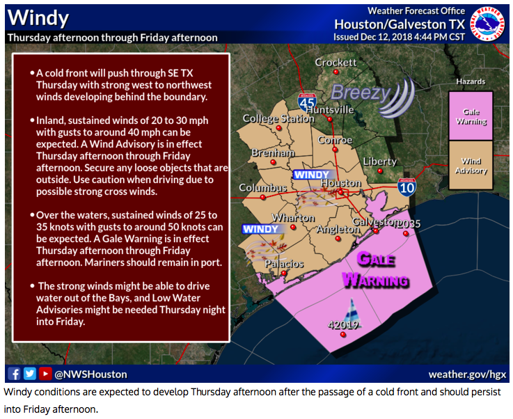 Showers and thunderstorms are expected during the early morning hours ahead of the upper level low. A few of the storms could become severe across along and E of I-45. Some brief heavy rain will also be possible but the storm motion will be rapid. The strong winds will be the highlight beginning tomorrow afternoon into Friday. Wind Advisories in effect for all but NE portions of SE TX with Gale Warnings for the coastal waters. Winds gusting 30-40MPH inland and possible up to 50MPH over the coastal waters. Again make sure your Christmas decorations are anchored. I would not like to see Snoopy blowing over the house but the Grinch maybe.