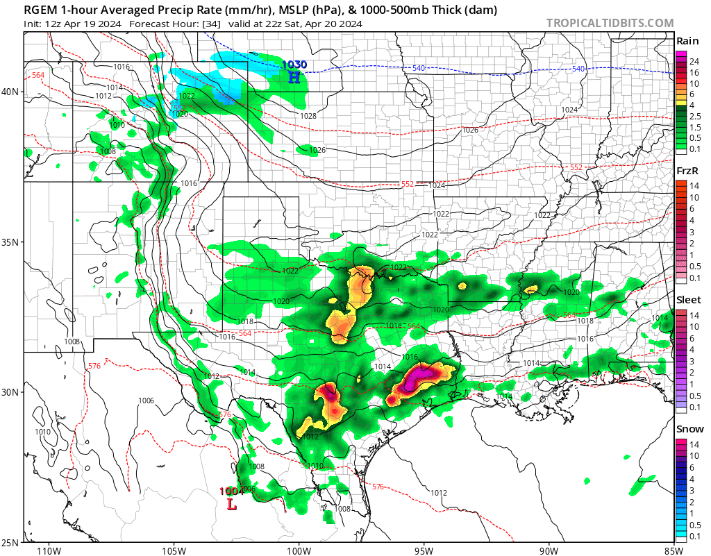 You can see it advancing on satellite. Things are about to go boom! between your place and mine.DoctorMu wrote: ↑Sat Apr 20, 2024 1:29 pm The dryline/front just blasted through. DP at 66°F and tanking. Brisk northerlies and heavy cloud. there's plenty of moisture aloft. I'm hoping for 2-3 inches of the liquid gold.