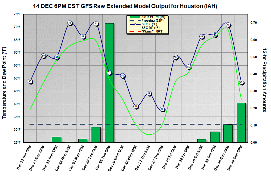 12Z GFS is certainly warmer for Christmas week. Yesterday's runs had lows below freezing with dew points around 13F. Quite a change on today's runs. Euro backed off on the cold, too. No guarantee the cold won't come, through. Don't trust the models when they swing 30 degrees for our temps on alternate runs. Here's what the latest GFS has for us on Christmas. Note that the temperature times are 6am and 6pm, so the highs will be a bit higher than indicated. Highs around 70-72 are indicted for Christmas Day with a low of 65deg or so.