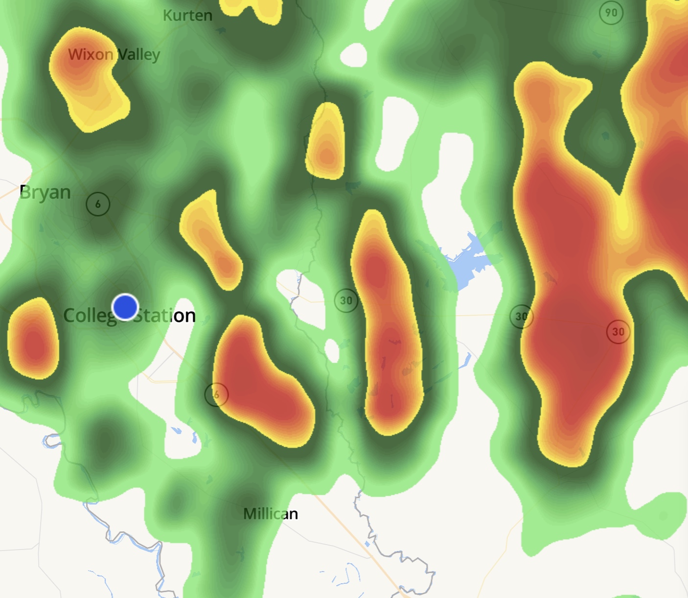Man El Campo is getting hit hard right now. It’s thundering like crazy at my house. I haven’t heard thunder like this all summer. It’s just going to miss me though a few miles to my south unless some new development pops.
