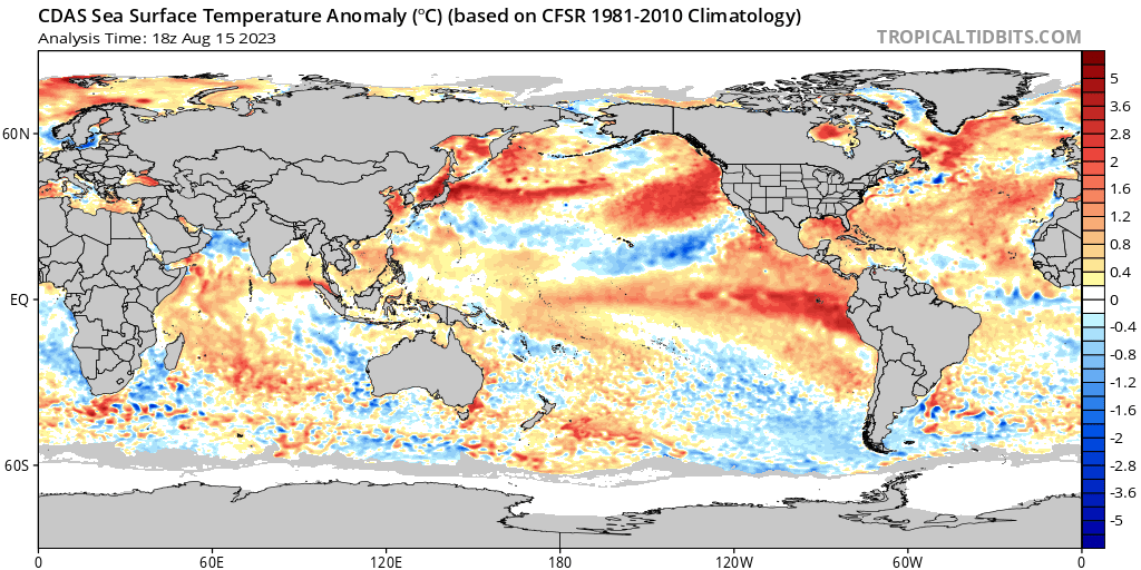 On a positive note, the -PDO in the Eastern Pacific I’ve been harping about all year continues to shrink and is slowly taking on a more +PDO orientation with time. This, in conjunction with a prominent El Niño should theoretically work in our favor in the long term regarding rainfall potential beginning in the 2nd half of September or the 1st half of October while continuing on & off through the remainder of the year into 2024. We shall see.