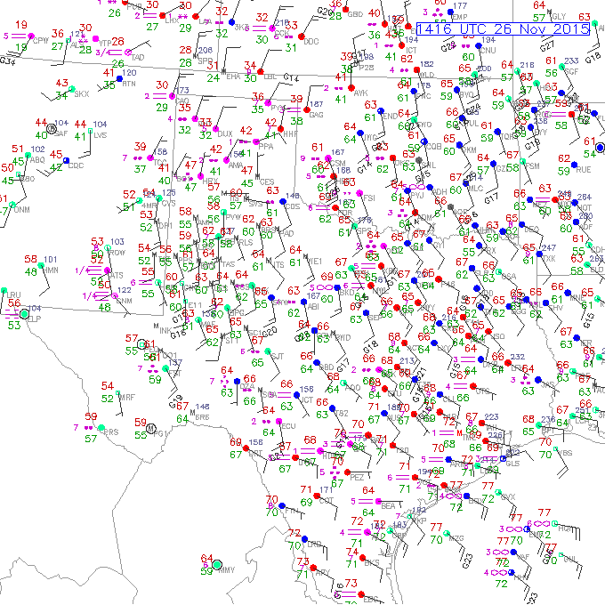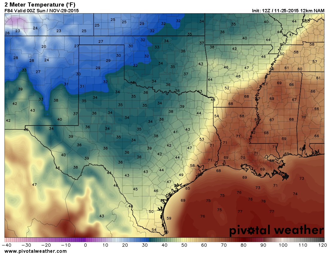 Frontal boundary marked by a solid 20-25 degree temperature drop is located from east of Dallas to north of Austin and NW of Del Rio. Temperatures ahead of this boundary are in the humid mid to upper 70’s and fall quickly into the 40’s and 30’s behind the front. For example Hobby Airport is currently 79 versus 47 at Waco and 36 at Childress. As suspected the shallow yet dense air mass is forcing southward faster than the models were thinking and the front is running about 2-3 hours ahead of even the fastest guidance. Expect the front to reach our NW counties in the next few hours and then toward the US 59 corridor between midnight and 300am. Front will really begin to lose its forward push south of I-10, but like the TX TECH handling of the boundary which goes ahead and pushes it off the coast into the 0-20 miles range offshore before stalling. Expect cold air mass to overspread much of the region with temperatures running from the low 40’s near College Station to near 60 along the coast over the weekend. These may be a few degrees too warm especially near the coast, but there is uncertainty on exactly where the front stalls.