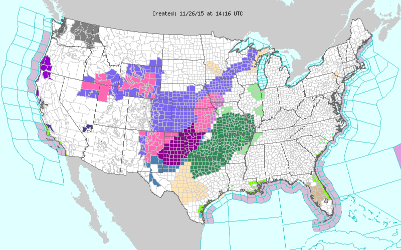 Warm temps with partly to mostly cloudy skies across SE TX this morning. Expect warm, humid, cloudy, weather with scattered showers through Friday afternoon before slightly cooler temps arrive with continued rain chances. Temps approach 80F for Thanksgiving and Friday. Severe weather and flash flooding still not a threat for SE TX. Central and NTX are most likely to see a prolonged rain event which may create flooding conditions by the weekend as moisture from Hurricane Sandra move across TX and combines with a slow moving cold front. Freezing rain will be a concern from NW TX and the TX Panhandle through the weekend. Flash Flood Watches have also been issued across a large portion of OK. If you have travel plans for the holiday weekend, stay weather aware.