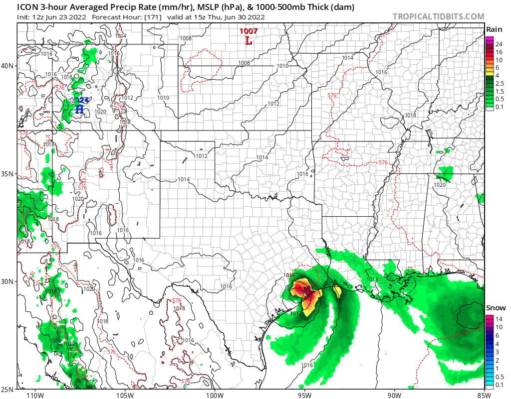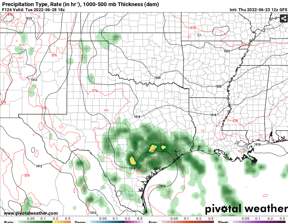 Then we have an accord.Cromagnum wrote: ↑Wed Jun 22, 2022 12:47 pmcaptainbarbossa19 wrote: ↑Wed Jun 22, 2022 12:40 pmI just looked and due to all the rain/clouds, the GFS only has our highs in the 80s most of next week. That seems hard to believe! However, I am thinking now that this weekend may not be quite as hot as projected a few days ago. I am thinking now right around 100 instead of 105+ for most areas.don wrote: ↑Wed Jun 22, 2022 12:20 pm Sure does look good indeed, it also shows the low level vorticity some of the other models have been picking up on.But keeps it partially inland riding the coast of Louisiana and moving west into Texas which helps to enhance rainfall with the stalled frontal boundary.![]()