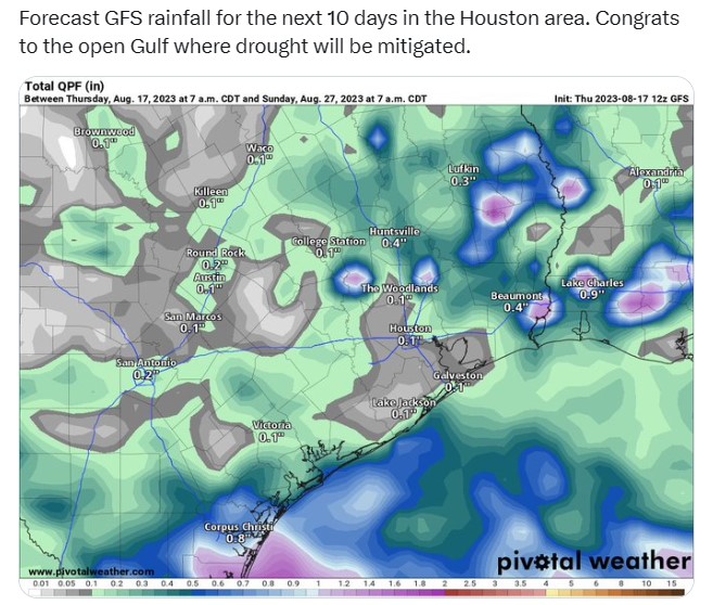 The mosquitos then should be SO DEAD in CLL. 109°F today. 39 days in a row of 100°F+. DPs were higher than yesterday.MontgomeryCoWx wrote: ↑Thu Aug 17, 2023 9:14 pmIt will just play out later than normal UNLESS we go from extreme to the other in a short manner.