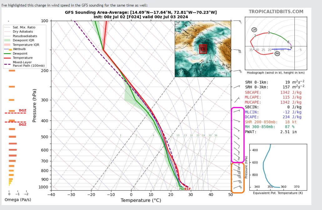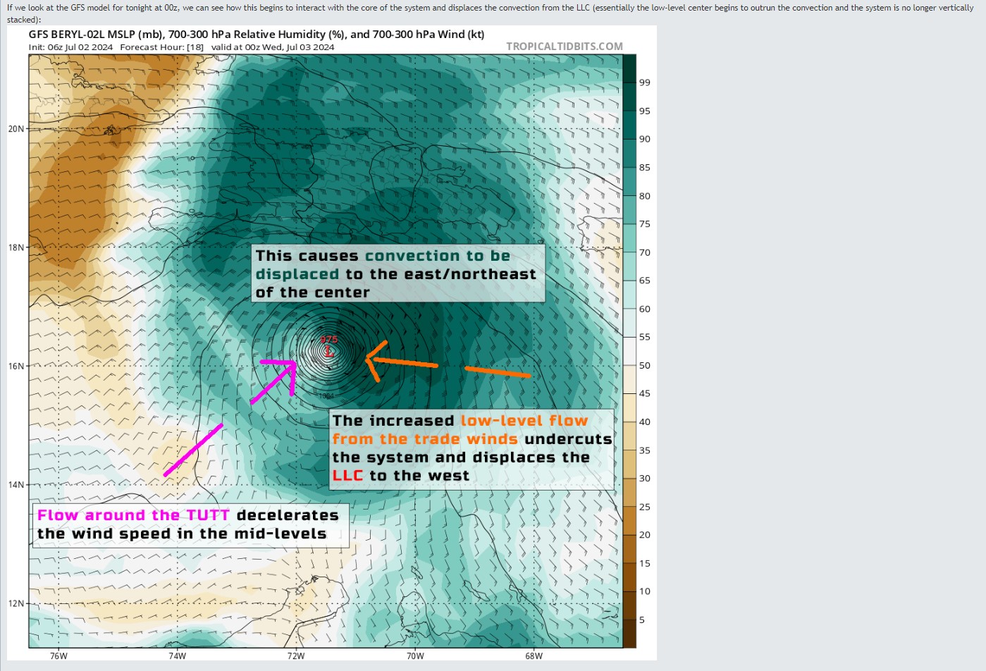 Larger systems can fend off hostile conditions easier, but smaller systems like Beryl have a harder time doing so. My question though is that it appears the shear is moving W in tandem with Beryl, so I’m not sure how much shear it’ll actually run into?