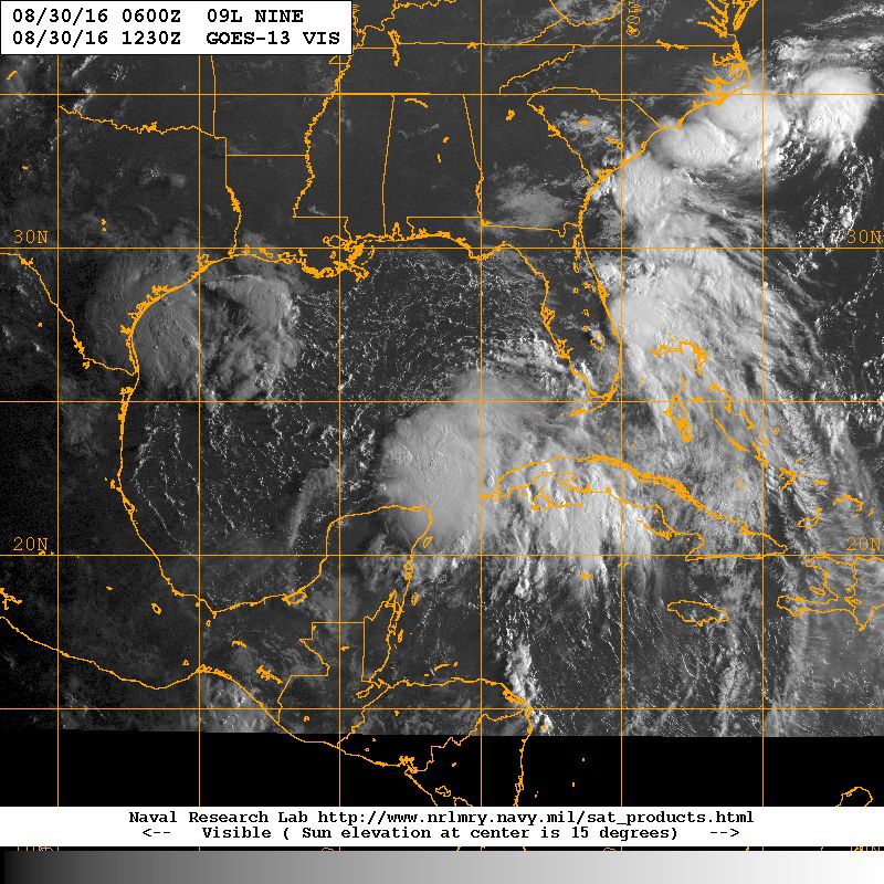 2km Visible Imagery captures the Tropical Disturbance along the Texas Coast, TD 9 in the Southern Gulf and TD 8 near the North Carolina Coast. Only one may actually achieve a name later today and that would be Hermine in the Southern Gulf of Mexico