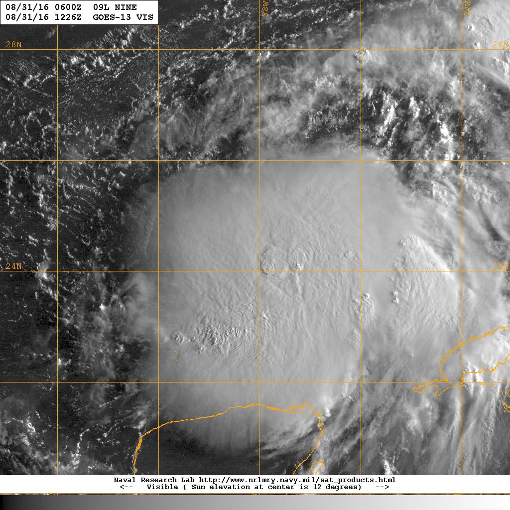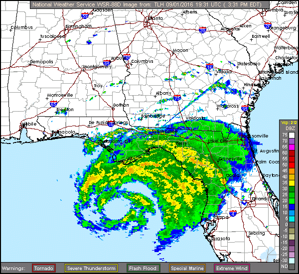 Hermine continues to intensify this morning and now afternoon with the central pressure haven fallen from 1002mb yesterday evening down to 988mb on the last recon pass. Flight level winds of 77kts were recorded and both the radar and satellite presentation looks good with deep convection having wrapped around the center of the system. Radar images out of Tallahassee show a well developed and large eye like feature. This afternoon is the first time deep convection has successfully wrapped all the way around the center. Given the steady intensification today and continued fairly favorable conditions…Hermine will likely continue to strengthen up to landfall early on Friday.