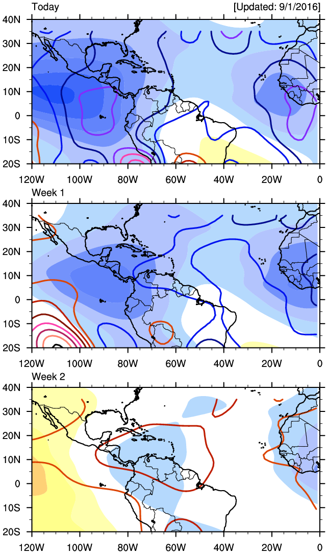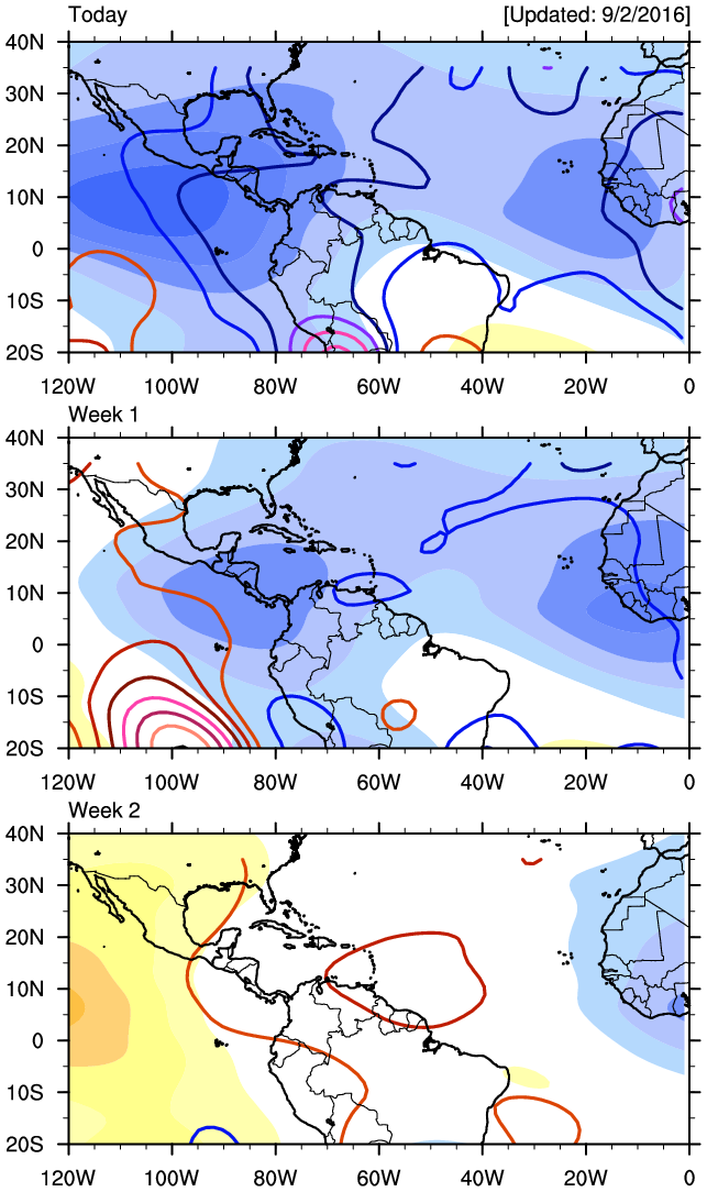INVEST 92L has been reactivated again. We will be monitoring this Tropical Disturbance very carefully since atmospheric conditions may become rather favorable for Tropical Development as a robust Madden Julian Oscillation Pulse arrives in the Western Atlantic Basin as well as a Convectively Coupled Kelvin Wave generating increasing lift of the atmosphere and greater instability allowing the development of tropical thunderstorms around and near the West tracking Tropical Disturbance, particularly later next week as it travels across the Caribbean Sea.