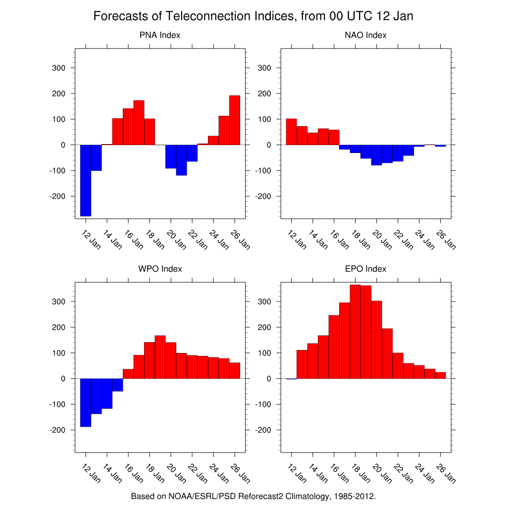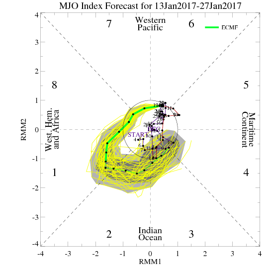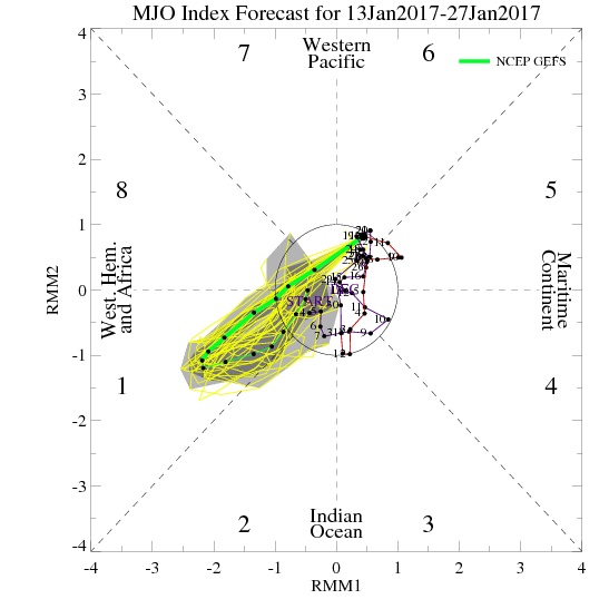 The Longer range MJO forecast via the ECMWF and GFS schemes suggest a wet and stormy pattern begins beyond January 20th. There are also indications that the Stratospheric Polar Vortex may shift more to Europe and begin to split possibly leading to a potential Sudden Stratospheric Warning or Major Mid Winter Warming event where high level winds reverse and often lend to much colder air at the surface where we live. While it is too soon to know exactly what our sensible weather may bring, the indicators we look to are tending to a Major Hemispheric Pattern Change as the end of January nears and we begin February. We will see...