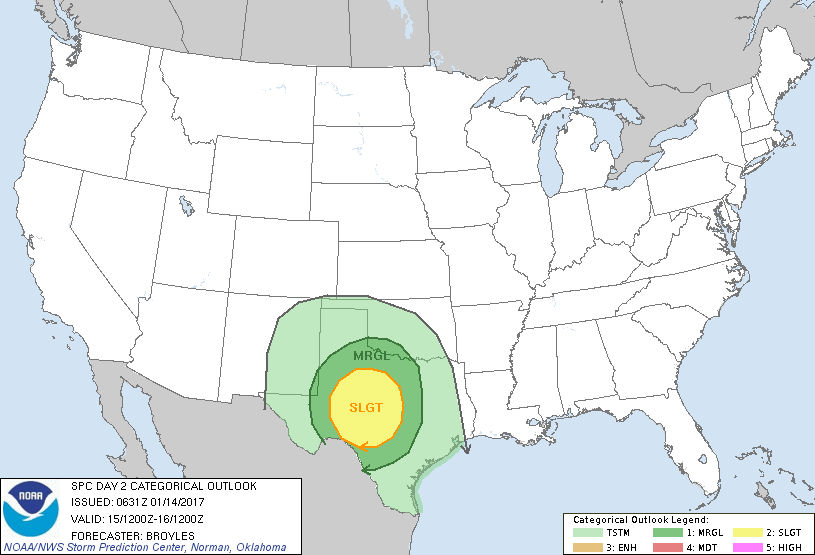 Morning analysis suggest a sneaky cold front that has been responsible for the Ice Storm across the Southern Plains and the Mid Mississippi Valley as drained colder air into Central Texas and the Brazos River Valley in College Station. Do not expect the front to move much further South day as a powerful Storm System moves East from Southern California/Baja Peninsula today setting the stage for strong to severe storms tomorrow across portions of Permian Basin and Central Texas. As the Storm and the associated upper trough near SE Texas Sunday evening there is a chance for a line of thunderstorms to organize and push into our Region early Monday.