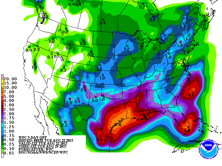 My concern regarding a possible inland flood event lasting several days has increased overnight regardless of where Harvey makes its landfall whether it is a moderate to strong Tropical Storm or weak Hurricane. The very slow movement after nearing the Texas Coast is rather worrisome.