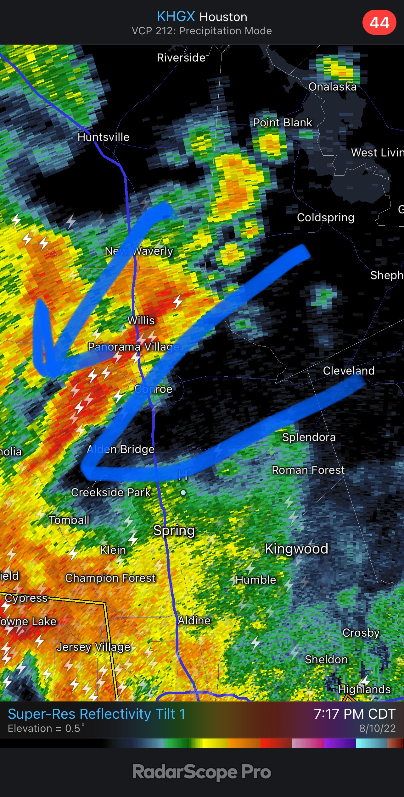 Well all that stuff towards Huntsville and Willis was headed this way but the flow changed and it’s pushing it to the Southwest. Now I’m stuck in a wedge of nothingness. The thunder has also died down considerably in the last 10 minutes.