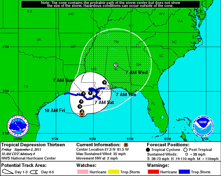 Tropical Depression Thirteen formed last night over the Northern Gulf of Mexico and is slowly intensifying, but isn't in a hurry to go anywhere. What TD 13 will do is dump torrential rains along the northern Gulf Coast over the next three or more days. So far, rain amounts along the coast have mostly been below one inch. At New Orleans Lakefront Airport, just 0.32" inches of rain had fallen from TD 13 as of 10 am CDT. Some coastal regions have received up to two inches, according to radar rainfall estimates. TD 13 is generating a large area of 30 - 35 mph winds over the Gulf of Mexico. At 7:20 am CDT, winds at the Mississippi Canyon 711 oil rig were southeast at 47 mph. This is above tropical storm force, but the wind instrument was 348 feet (106 m) above the ocean surface, and winds near the surface were probably considerably lower, near 35 mph. Latest surface wind observations from an Air Force hurricane hunter aircraft support leaving TD 13 as a tropical depression. Long range radar out of Mobile, Alabama shows heavy rain showers building along the northern Gulf Coast, but these rain showers are not well-organized into spiral bands. Strong upper-level winds out of the west-northwest are creating a moderate 10 - 20 knots of wind shear over TD 13, keeping the storm's heavy thunderstorms disorganized and pushed to the east side of the storm. However, latest satelllite loops show TD 13 is becoming increasingly organized, with a respectable spiral band forming on the southeast side, and an increase and areal coverage of heavy thunderstorm activity. This is very likely to be a tropical storm later today.