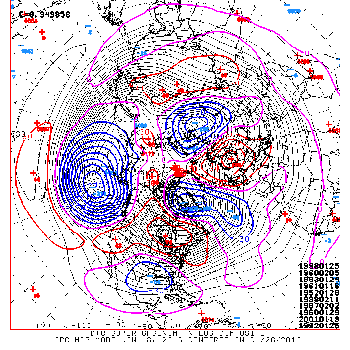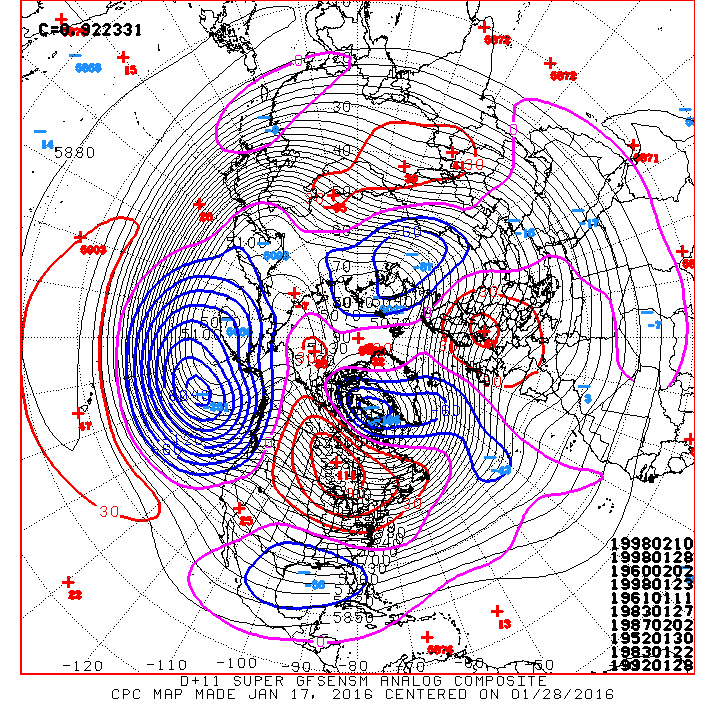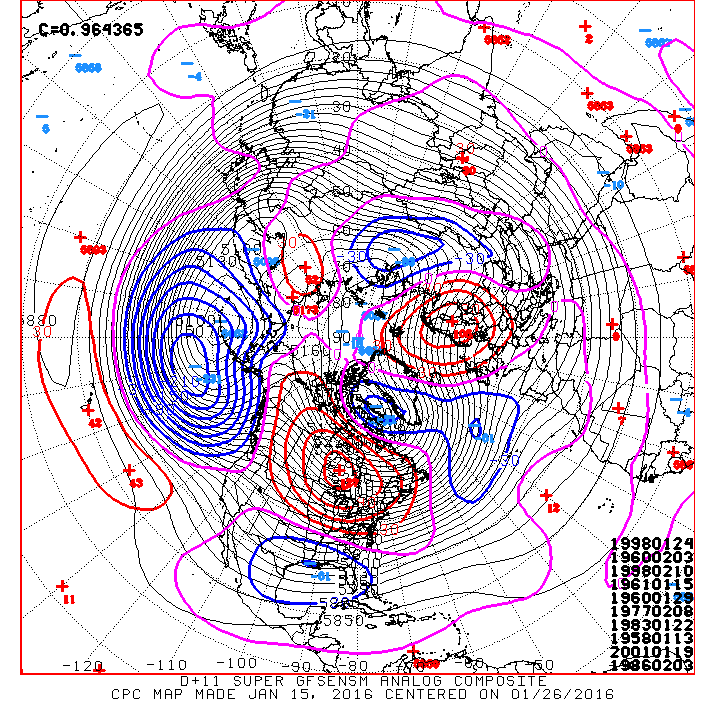 The 00Z Climate Prediction Center Day 11+ GEFS Super Ensembles Analogs continue to advertise a chilly and unsettled pattern late January into early February. Interestingly one of the biggest snowfalls recorded in Houston occurred on February 12, 1960 when 4.4 inches of snow was measured. I have a picture of me playing in that snow event. Perhaps I will scan that black and white old photo today and post it.