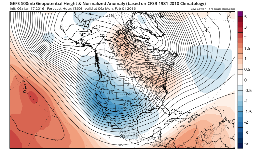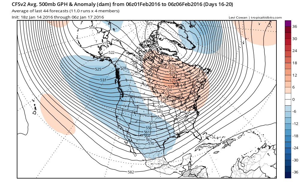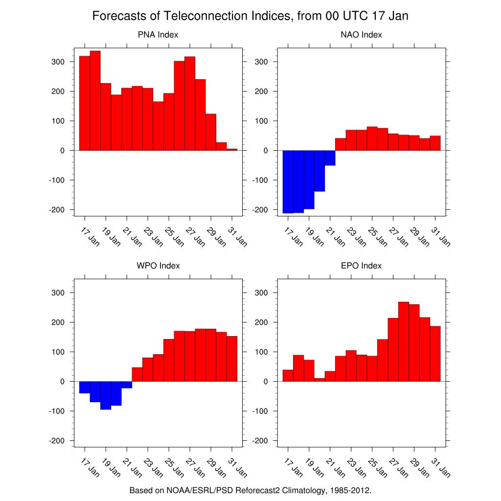 The current Teleconnection Indices and the MJO suggest the tropical convection has shifted back to the Indian Ocean. The morning Updated GEFS Super Ensemble Day 11+ Analogs do suggest the chance of Western Gulf lows developing with the best chance of precipitation along the West Coast, Gulf Coast, Florida and the South Eastern United States. The overnight Operation and Ensemble Guidance are 'sniffing' the potential of a rather potent Storm System during the late January timeframe. Chilly and unsettled weather looks to build across the Western half of the Lower 48 during the late January timeframe with Ridging and a warming trend areas across the Plains and the East Coast. Some of the longer range ensemble guidance does suggest that changes may be lurking across Western Canada as we end January and begin February. Those ensembles are indicating that below normal temperatures will finally develop across our source Regions of Eastern Alaska and Western Canada. IF the longer range ensembles are correct, such a pattern may coincide with our climatologically favored wintry weather peak season of early/mid February. We will see.