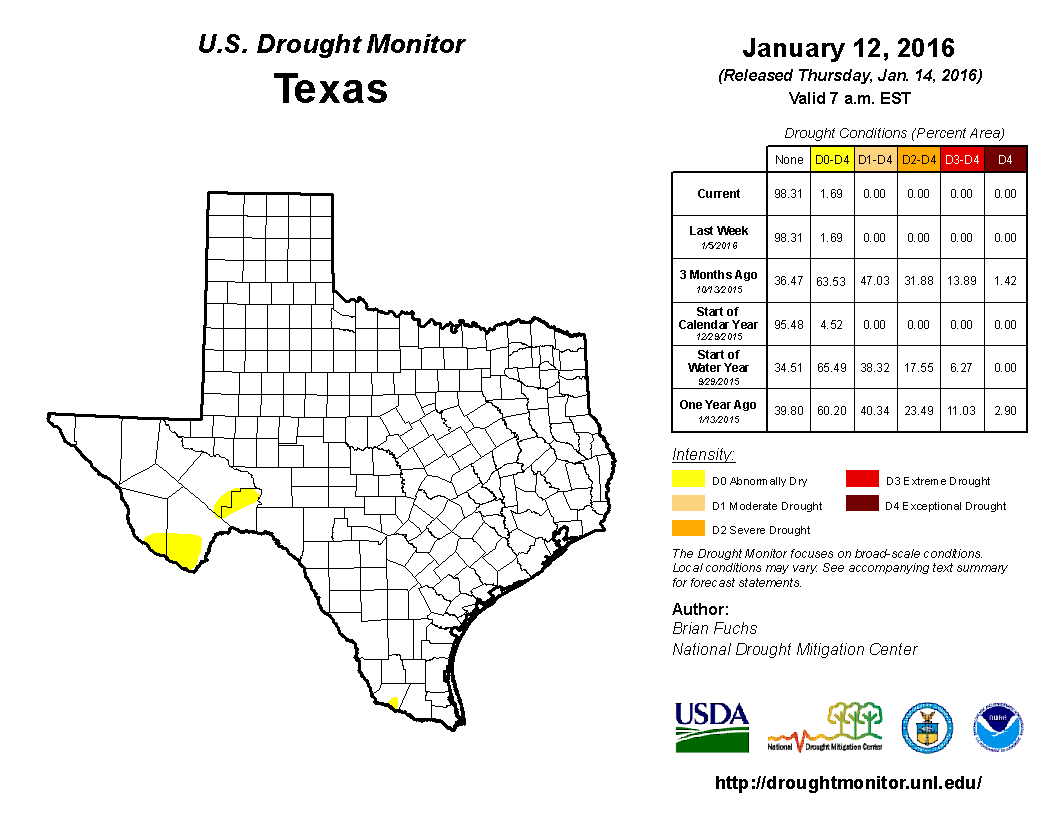 A fast progressive flow continues across the Lower 48 with Pacific Storms lined up set to impact Northern California through the coming week. The Sierra's and the Cascades are benefiting with the current pattern with some locations nearing 250% of there annual snowfall. That is very beneficial for those drought parched Regions out West. Our Texas Drought has been totally wiped out, which is a good thing considering where we were just a short year ago. This strong El Nino has certainly benefited many areas that sorely needed persistent moisture to replenish the snowpack and our local Region's area lakes.