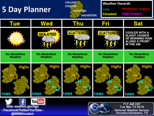 Unsettled weather across SE TX the next few days. The SPC has a slight risk area across portions of E TX, Central LA, and S MS today. A large marginal risk area exists across S, Central and SE TX along the N Central Gulf Coast to S AL Friday.