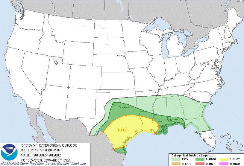 1630Z Updated Storm Prediction Center keeps a Marginal and Slight Risk with a Enhanced Risk of Severe Storms across portions of our Region which includes Louisiana. A Hatch Risked of Damaging Hail is indicated across portions of East and SE Texas mainly along and East of a Madisonville to Lake Livingston line.