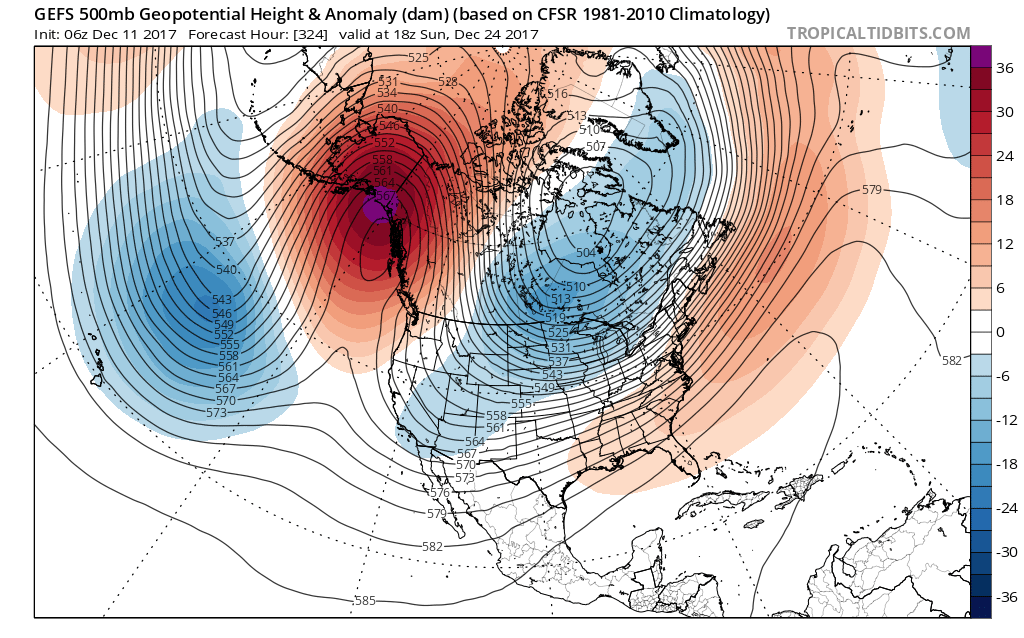 The GEFS/ECMWF EPS Ensembles are fairly consistent with a highly amplified pattern as Christmas arrives. While it is far too soon to know the "finer details" at this range of 2 weeks out, the indicators we look to in the longer range do raise an eyebrow. Christmas Week could be very chilly across much of the Lower 48 should this type of pattern verify. Those heights shown even in the Ensemble 2 weeks out suggest the strongest and likely coldest High Pressure domes we have seen so far this season over Alaska dropping through Western Canada into the Northern Rockies.