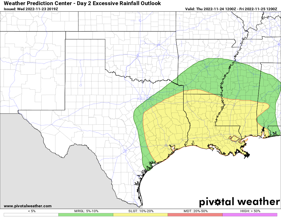 Surface warm front will approach the upper TX coast early Thursday morning and move inland during the morning hours. Moisture and lift both increase during this period and expect showers and thunderstorms to increase in coverage and intensity near the warm front. Warm front may approach the US 59 corridor by midday before slowing and potentially stalling Thursday afternoon. High resolution guidance has trended toward a line or several clusters of strong thunderstorms with very heavy rainfall developing near the warm front Thursday midday into the afternoon hours. Parameters will certainly be in place along and south of the warm front for isolated severe storms and excessive rainfall with good low level inflow off the Gulf, moisture levels over the 90th percentile for mid November, strong lift, and a nearly saturated warm layer. A lot of the parameters on a flash flood decision tree are checked and warm fronts are notorious in these sort of setups for producing excessive rainfall. Best case is the warm front is held closer to the coast keeping the heavier rainfall in coastal Brazoria and Galveston Counties.